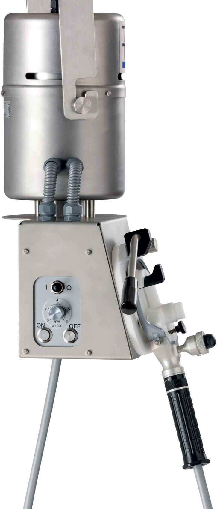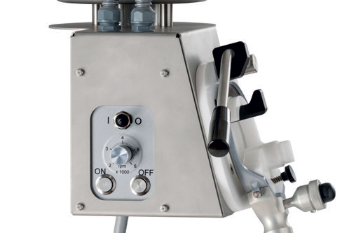 The revolution speed is selectable between 2’000 and 6’000 rpm. Depending from application an requirement you always have the ideal revolution speed at you disposal. This allows a more fatigue-proof work and increases the efficiency. Safe admittance of all hand pieces in all sizes. Automatic stop gadget whilst hanging-up the hand piece. The housing of the motor unit is made from high-quality stainless steel and corresponds to the degree of protection IP56. The coverage of the frequency converter is also made of robust stainless steel.